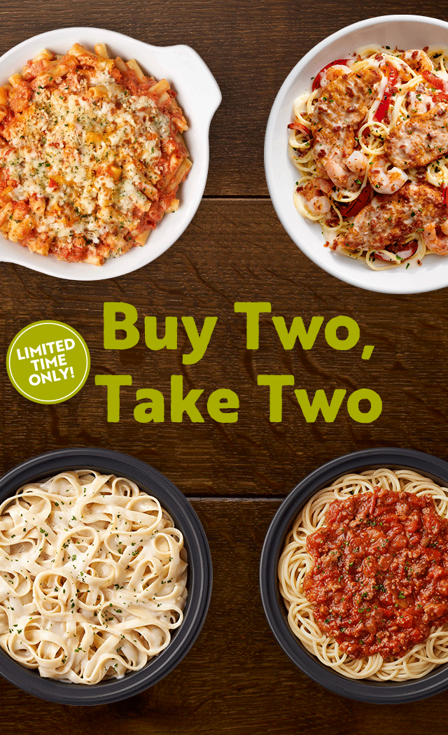 Grab your favorite pasta lover and join us tonight for two of your favorites paired with unlimited soup or salad and breadsticks. Then choose two free Take Home Entrées to enjoy tomorrow!