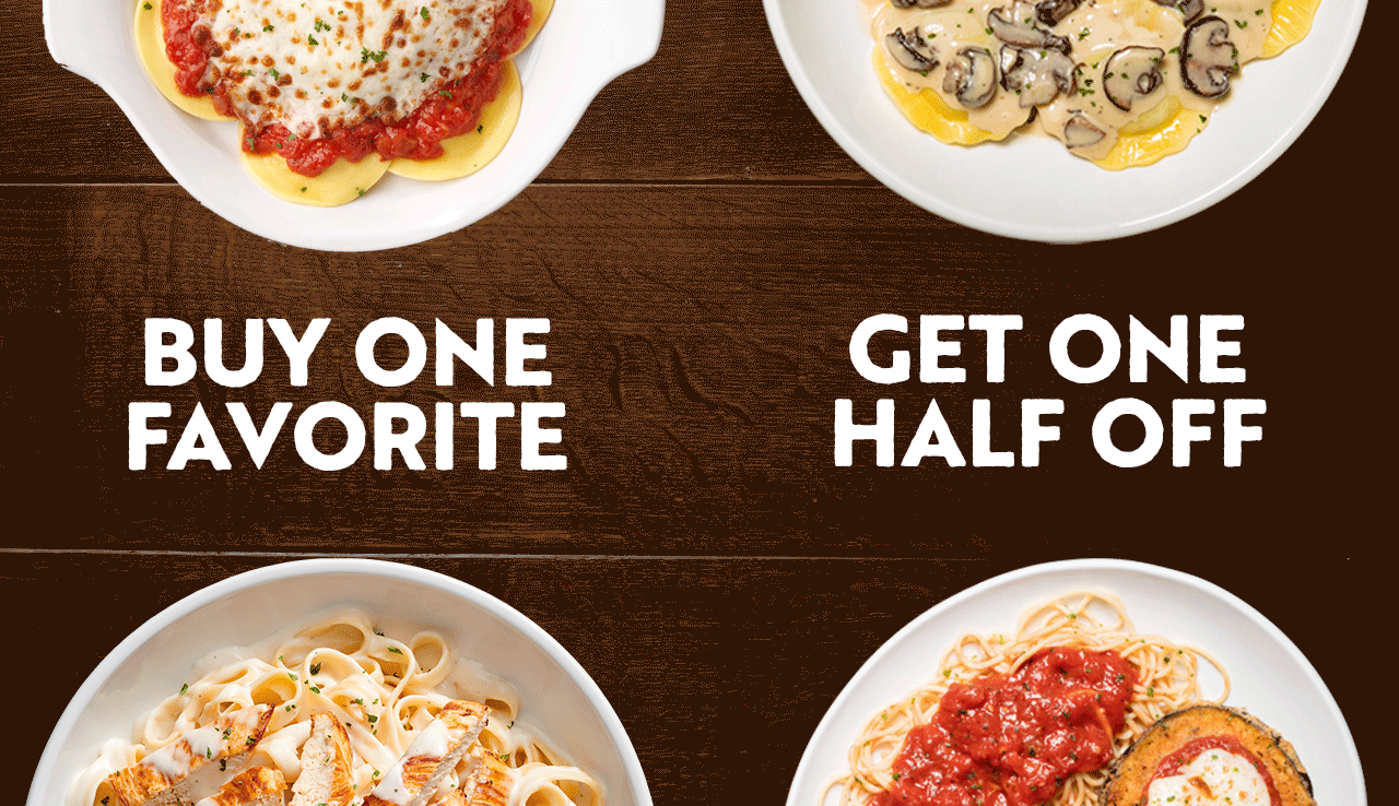 | This coupon may redeemed for 50% off one (1) adult Lunch entrée with the purchase of one (1) regular price adult Lunch entrée. Limit one coupon per check. Excludes appetizers, kid’s menu items, alcoholic beverages, tax and gratuity. Sales tax paid by the bearer. Coupon may not be redeemed for cash or combined with any other coupon or used with any other offers. Cash redemption value is 1/20 of one cent. Coupon may not be reproduced, sold, transferred or traded. Offer is valid only at any Olive Garden Italian Restaurant location in the continental U.S. Visit olivegarden.com. © 2019 Darden Concepts, Inc. Offer Valid: 12/16/19–12/18/19. |