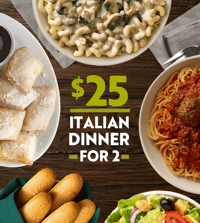 Start with unlimited homemade soup or garden-fresh salad and freshly baked breadsticks. Then enjoy two entrées with your choice of pasta, sauce and topping from our Create Your Own Pasta menu. Plus, end on a sweet note and choose any full-size dessert to share. A delicious dinner for 2, all for just $25!