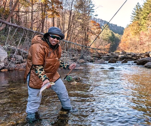 Use points to fly fish Maggie Valley, NC, and enjoy a multi-course seafood dinner at a Homes & Villa by Marriott Bonvoy with Chef and Sommelier, Ashleigh Shanti.