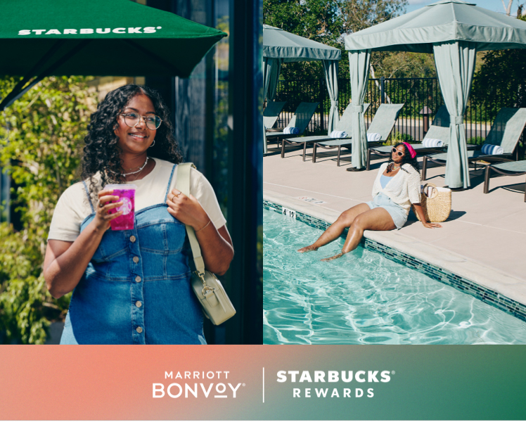 † U.S. only. Must link accounts to participate in offer. Qualifying Starbucks transactions must be made at participating U.S. Starbucks stores and exclude purchases of alcoholic beverages, Starbucks Card eGifts and physical Starbucks gift cards. To earn Double Stars, the applicable stay must qualify as an Eligible Stay at a Participating Marriott Bonvoy Hotel under offer terms and conditions. Other restrictions and exclusions apply. For full offer terms and conditions, visit starbucks.com/marriottbonvoy.