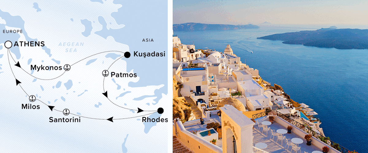 | Greeted by glistening azure seas, Mykonos and Santorini beckon. UNESCO treasures in Rhodes and Kusadasi offer glimpses into ancient Ephesian and Greek culture. |